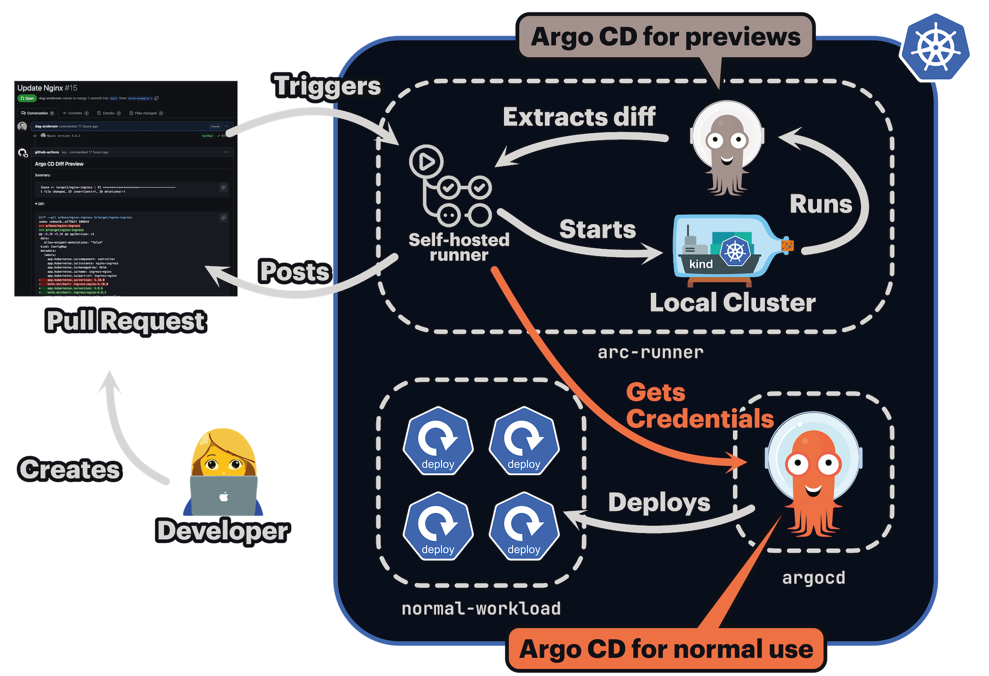 This guide covers two main approaches for using self-hosted runners with argocd-diff-preview.