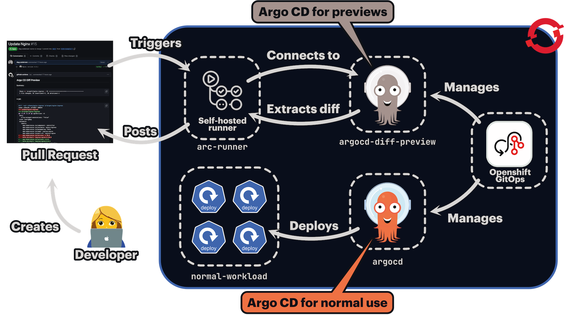 Utilizing the Openshift GitOps operator for managing the pre-installed ArgoCD instance comes with low overhead of managing another ArgoCD instance. It is included in the Operator upgrade process and is in line with the ArgoCD instances in the cluster used to deploy applications. In this setup, there is also no need to run argocd-diff-preview as DinD (Docker in Docker) which further increases security. In addition, if there are network settings in place in order to access private repositories outside of the Openshift cluster, this will work right away with this setup. If the main ArgoCD instance is also used to deploy its own configuration (e.g. ssh-known-hosts, tls certs, etc.) in a GitOps way, the instance for argocd-diff-preview can be configured in the same way for faster integration.